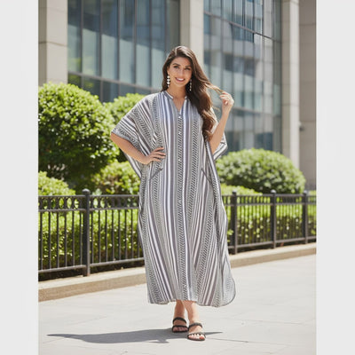 Feel confident and stylish in our Striped Plus Size Kimono Polyester Kaftan collection, featuring loose and comfortable maxi dresses for women of all sizes.