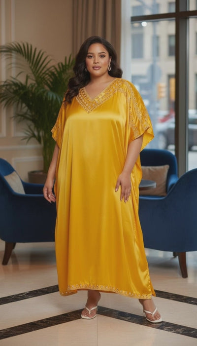Dive into our range of Yellow Satin Plus Size Kaftans adorned with beautiful embroidery lace. Embrace both fashion and comfort in each piece!